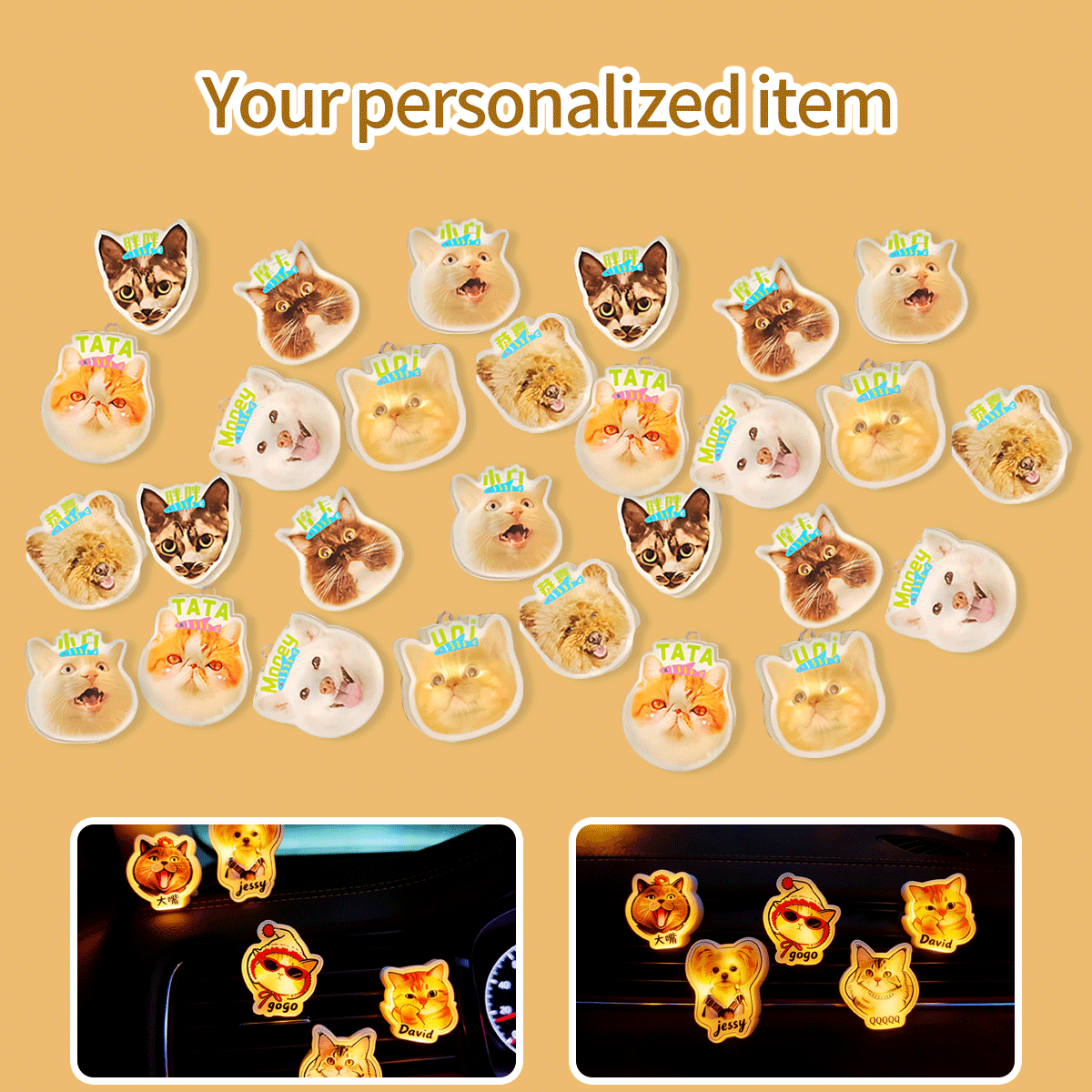 This personalized pet aromatherapy slap lamp turns your favorite cat or dog photo into a cute glowing car vent accessory. It combines soft lighting with customizable fragrance, making your car a cozy and personalized space. The fun pat switch operation adds a playful touch to your daily drive.